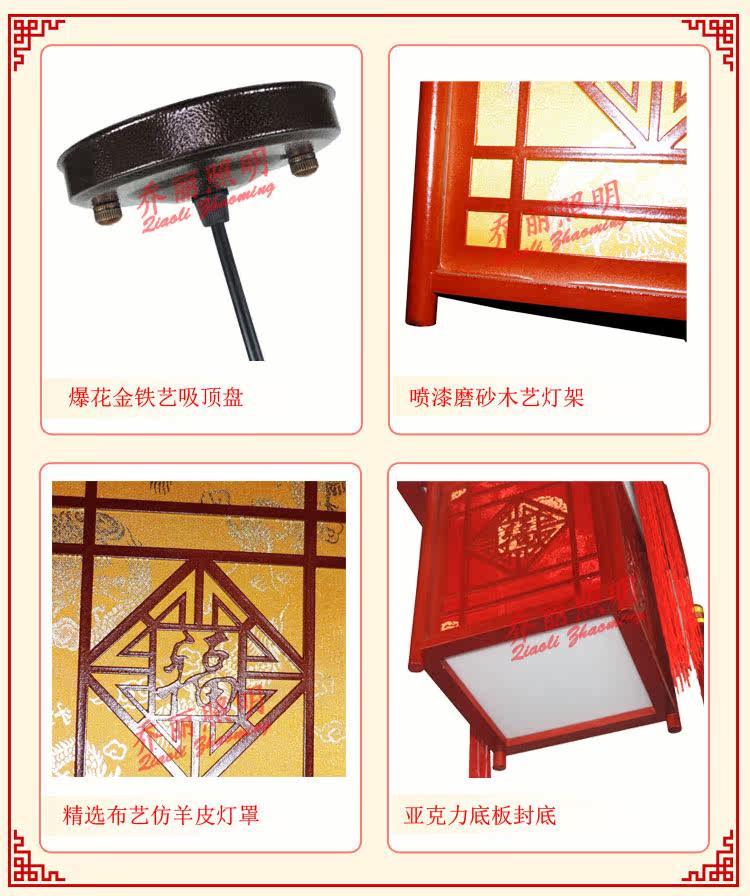 【材质】高档仿古木艺雕刻框架+台湾进口防火仿羊皮灯罩